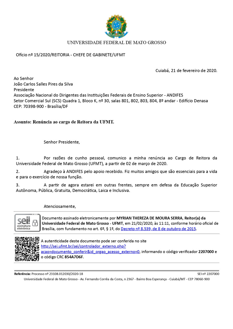 "Por razões de cunho pessoal, comunico a minha renúncia ao Cargo de Reitora da Universidade Federal de Mato Grosso (UFMT), a partir de 02 de março de 2020", consta no documento.