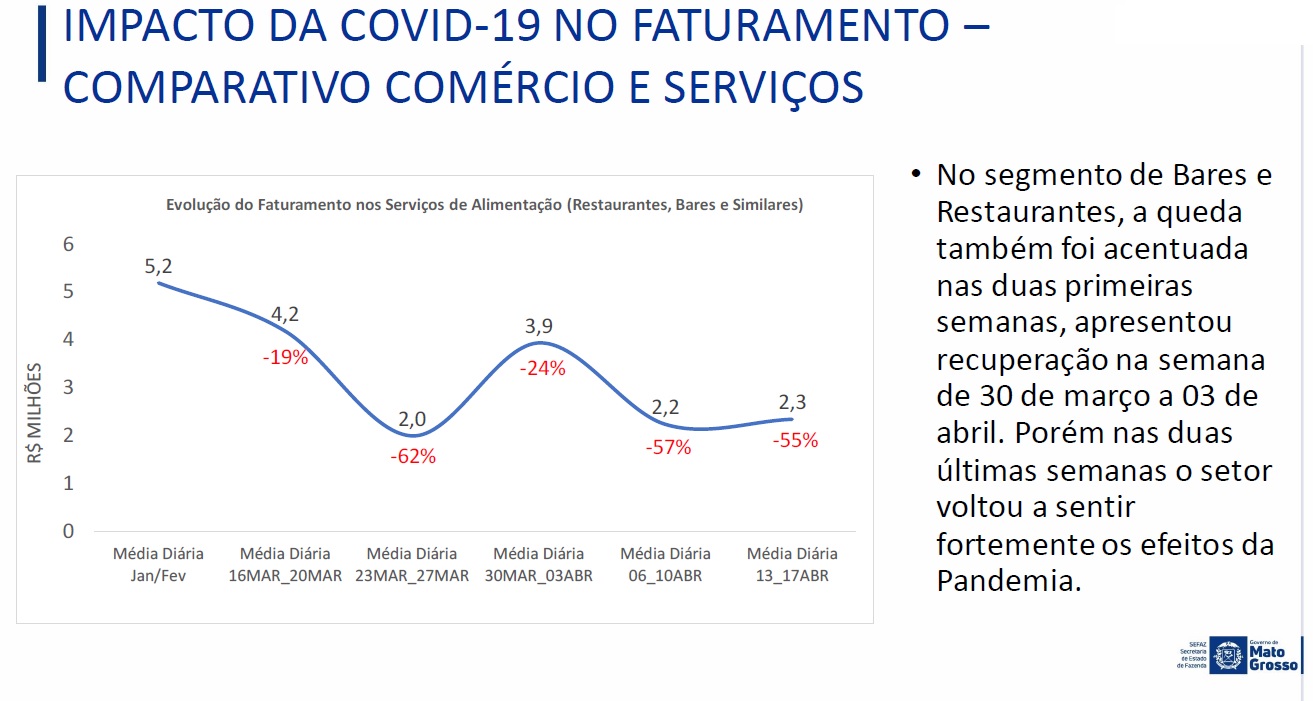Os serviços de alimentação, composto por bares, restaurante e similares, tiveram uma queda diária de arrecadação de R$ 2,1 milhões, no mês de março, na receita em razão da pandemia do novo coronavírus (Covid-19).